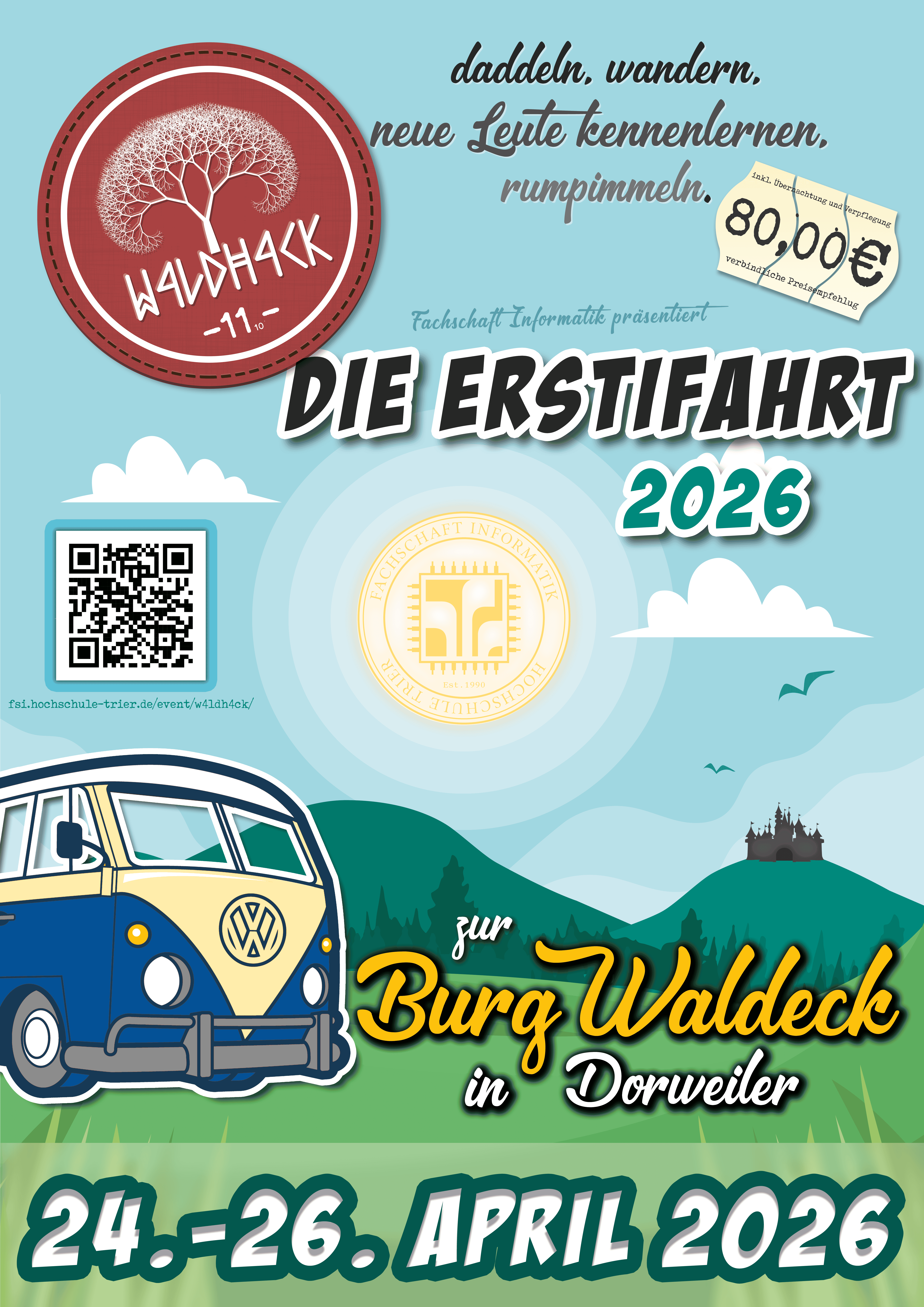 Die „w4ldh4ck“ ist eine Fahrt in ein abgelegenes Gebiet in der Natur – speziell, aber nicht nur für Erstsemester. Eine gute Gelegenheit, eure Kommilitonen kennenzulernen, mal raus zu kommen und ein Wochenende zu chillen. Bereits in elfter Auflage!